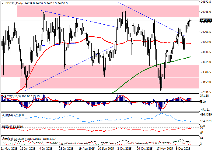 Sesja poniedziałkowa na rynku niemieckim skończyła się zwyżką DAX-a o 0,05 procent. Skromna zmiana procentowa korespondowała z niską zmiennością i faktycznym oscylowaniem indeksu wobec poziomu zamknięcia sesji wtorkowej. Całość sumuje się nie tyle w układ konsolidacyjny, co w zamrożenie rynku w świątecznym wyciszeniu, które dziś znajdzie zapewne przedłużenie dzięki skróceniu sesji rynku kasowego o niemal połowę. Kontrakty wpisały się w ten układ sił wykreśleniem świecy o skromnym korpusie, któremu towarzyszą dwa cienie. Szersza perspektywa została bez zmian i zapewne zostanie bez zmian również dziś. Na wykresach dominuje gra w konsolidacji ograniczanej oporami w strefie 25000 pkt. i wsparciami w rejonie 23000 pkt. W efekcie, rynek ma stale przed sobą temat wybicia z konsolidacji, bez którego nie będzie przesilenia w oswojonych i aktualnych trendach bocznych. Zachowanie rynku nie zaskakuje, gdy uwzględni się przebiegi średnich z 50 sesji i 200 sesji, którym coraz bliżej do solidarnego wypłaszczenia, co wzmacnia trend boczny i sygnalizuje neutralność momentum. Układ sił sumuje się w znany przymus czekania na przesilenie lub chociażby test granic konsolidacji. Warto też odnotować, iż zmienność kontraktu mierzona ATR z 14 sesji wynosi teraz około 225 punktów, więc testy granicy konsolidacji stają się tematem na styczeń.