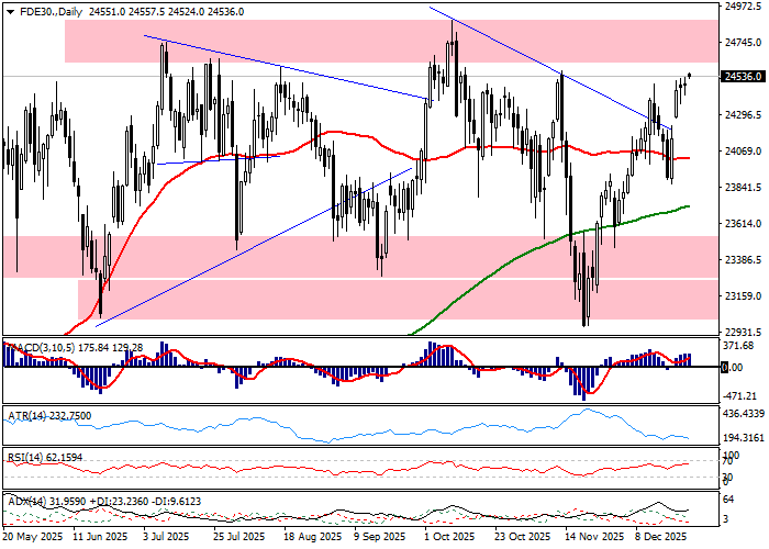 Niemiecki DAX skończył ostatnią przedświąteczną sesję zwyżką o 0,23 procent. Rozdanie ustaliło też wynik dwudniowego tygodnia na wzrost o 0,20 procent. Powrót do gry po pięciu dniach bez sesji na rynku kasowym odbędzie się w ciągle świątecznym kontekście, gdyż giełda niemiecka nie pracuje w środę, 31 grudnia, a sesja wtorkowa – jednocześnie finałowa w 2025 roku – zakończy się o 14:00 czasu polskiego. W praktyce, gracze mają powody do zachowania dystansu, co już owocuje kreśleniem skromnych szpulek na wykresie pochodnych. Niemniej, wykres CFD pokazuje, iż kontrakty pozycjonują się pod wzrostowe otwarcie na rynku kasowym, które będzie próbą przedłużenia wzrostowej serii trwającej już pięć tygodni. Obraz techniczny pozostaje jednak bez zmian. Na wykresie dominuje gra w konsolidacji ograniczanej oporami w strefie 25000 pkt. i wsparciami w rejonie 23000 pkt. W efekcie, rynek ma stale przed sobą temat wybicia z konsolidacji, bez którego nie będzie przesilenia w oswojonych i aktualnych trendach bocznych. Zachowanie rynku nie zaskakuje, gdy uwzględni się przebiegi średnich z 50 sesji i 200 sesji, którym coraz bliżej do solidarnego wypłaszczenia, co wzmacnia trend boczny i sygnalizuje neutralność momentum. Układ sił sumuje się w znany przymus czekania na przesilenie lub chociażby test granic konsolidacji. Warto też odnotować, iż zmienność kontraktu mierzona ATR z 14 sesji wynosi teraz około 230 punktów, więc tylko jakieś ożywienie rynku może zaowocować testem górnej granicy konsolidacji jeszcze w tym roku.