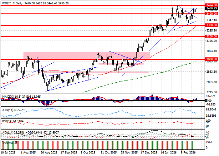 Rynek kasowy zaczyna sesję lepiej od oczekiwań. WIG20 rośnie o 0,8 procent niesiony na północ zwyżką 17 spółek, z których na plan pierwszy wybija się KGHM umocnieniem o 4 procent. Spółka odpowiada na zwyżki cen metali i zbiera przeszło połowę obrotu w WIG20. Słabe wczoraj spółki bankowe zyskują na wartości, ale indeks WIG-Banki rośnie razem z rynkiem o 0,8 procent. Otoczenie wspiera rynek zwyżką niemieckiego DAX-a o 0,5 procent. Technicznie patrząc wzrost WIG20 rzuca wykres na poziomy najwyższe w obecnej fali wzrostowej, więc indeks kontynuuje ruch po wybiciu z konsolidacji, ale do testu szczyty hossy ciągle brakuje 0,7 procent. W mocy zatem pozostaje zadanie pokonania strefy oporów w rejonie 3474 pkt.
