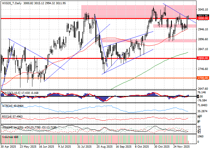 Środkowa faza sesji lokuje WIG20 na dziennych maksimach. Przesunięcie indeksu pozostaje jednak skromne i spadek o 0,2 procent zamienił się na zwyżkę o niespełna 0,1 procent. Efektem niskiej zmienności jest kreślenie przez indeks skromnego korpusu na wykresie dziennym, który sygnalizuje, iż rynek pozostaje w układzie konsolidacyjnym i nie traci kontaktu z 3000 pkt. Warto odnotować też fakt, iż popyt mocno atakuje na ważnej dla indeksu spółce KGHM, która rośnie o przeszło 2,5 procent odpowiadając na zwyżkę cen miedzi o 1,5 procent. Na spółkę przypada też około piąta część obrotu w WIG20. Bez zwyżki KGHM obraz WIG20 byłby jeszcze bardziej konsolidacyjny.