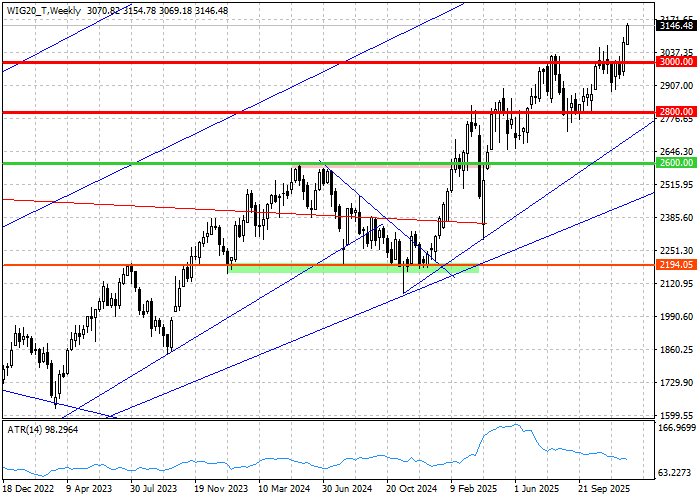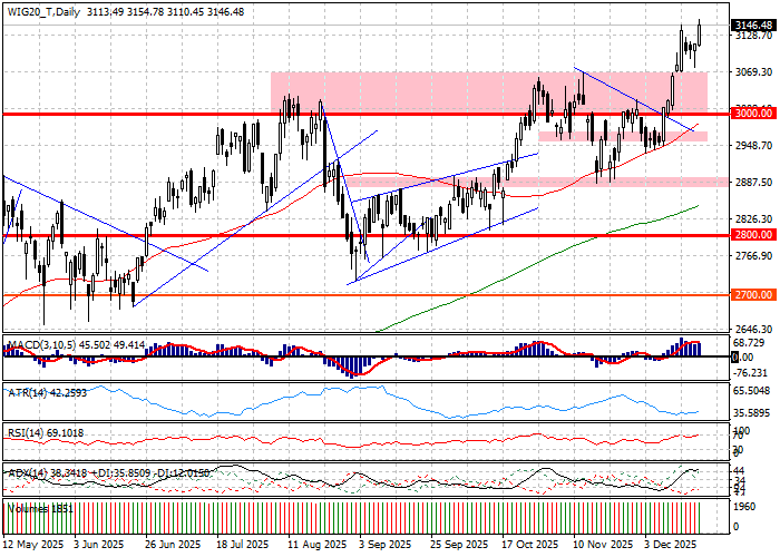 Finałowa sesja tygodnia na rynku warszawskim skończyła się zwyżkami najważniejszych indeksów. WIG20 wzrósł o 1,00 procent z obrotem przekraczającym 3,18 miliarda złotych, gdy indeks szerokiego rynku WIG zyskał 0,93 procent z licznikiem pokazującym niemal 3,87 miliarda złotych. Aktywność może wskazywać, iż rynek potwierdził uderzenie popytu obrotem, ale naprawdę większość została ugrana w finałowej godzinie sesji, gdy rynek rozliczał grudniową serię kontaktów na WIG20. W istocie, do finałowej godziny rozdania licznik WIG20 pokazywał około 1 miliarda złotych, więc przeszło 2 miliardy przypadły na ostatnie 60 minut handlu i finałowy fixing. Trzeci piątek grudnia został zatem zagrany w standardowym układzie sił, kiedy rynek kasowy chowa się w cieniu rynku terminowego. Niezależnie, bilansem sesji i tygodnia dla WIG20 jest wyznaczenie nowego rekordu hossy, który zalega teraz w rejonie 3155 pkt. przy zamknięciu dnia na poziomie 3146 pkt. Z perspektywy technicznej indeks blue chipów ma za sobą tydzień, w którym kontynuowana była fala wzrostowa związana z połamaniem oporów w rejonie 3067 pkt., gdzie zalegało też górne ograniczenie kilkutygodniowej konsolidacji. Układy na wykresach zapraszają do spoglądania na opory psychologiczne, które przejęły rolę barier technicznych. Uwzględniając okazywaną wcześniej wrażliwość rynku na poziomy 2800 pkt. i 3000 pkt. naturalnie w roli oporu narzuca się poziom 3200 pkt., który zalega ledwie 1,7 procent od dzisiejszego zamknięcia. W przypadku indeksu szerokiego rynku WIG, który skończył tydzień na nowym ATH, uwaga przesuwa się na psychologiczną barierę 120000 pkt. Oceniając szanse byków na spotkanie z oporami jeszcze w 2025 roku nie warto zapominać, iż rynek ma do rozegrania ledwie cztery sesje, które oddzielają od siebie dni bez handlu W praktyce gra z oporami psychologicznymi jawi się jako program na pierwsze tygodnie nowego roku.