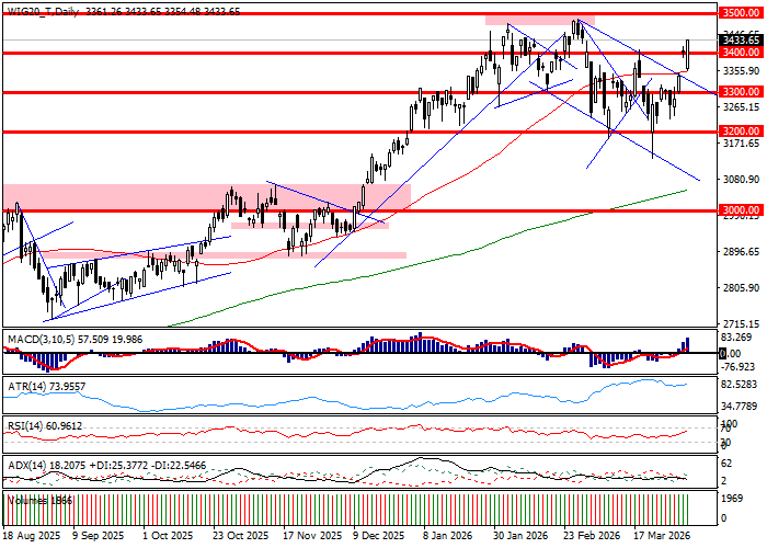 Finałowa sesja świątecznego tygodnia skończyła się zwyżkami najważniejszych indeksów. WIG20 wzrósł o 0,90 procent zbierając blisko 1,64 miliarda złotych obrotu, gdy indeks szerokiego rynku WIG zyskał 0,83 procent z licznikiem obrotu pokazującym niemal 2,02 miliarda złotych. Końcowe zmiany indeksów kryją w sobie mocne odbicie w perspektywie intraday po porannym spadku zagranym w solidarnej ze światem odpowiedzi na wystąpienie prezydenta USA. Donald Trump – w kontrze do nadziei inwestorów – nie zapowiedział końca wojny i nie przedstawił rozwiązania ryzykownego dla gospodarki światowej problemu zablokowania transportu surowców i towarów przez Cieśninę Ormuz. Efektem były mocne spadki w otoczeniu, którym towarzyszył dynamiczny wzrost cen ropy. W przypadku WIG20 zaowocowało to porannym spadkiem indeksu o około 1,4 procent, który został zagrany przy wzroście cen ropy o kilka procent, spadku niemieckiego DAX-a o około 2 procent i przecenie kontraktów na S&P500 o przeszło 1,2 procent. W takim ujęciu, finałowa zwyżka WIG20 kryje w sobie przeszło dwuprocentowe odbicie intra, które zostało zagrane w kontrze do otoczenia. Bilansem relatywnej siły rynku wobec giełd bazowych jest wyznaczenie przez WIG20 nowego maksimum odbicia po marcowej wyprzedaży spowodowanej wojną na Bliskim Wschodzie. Częścią tygodnia jest też załamanie marcowej fali spadkowej, w którym technicznie zorientowani gracze będą widzieli również wybicie z kanału spadkowego. Efektem jest skierowanie uwagi rynku na opory na szczycie hossy. Warto też odnotować, iż WIG20 skończył skrócony tydzień zwyżką, która była największą od blisko roku. Problemem w tym układzie sił staje się wyprzedzanie przez GPW wydarzeń na rynkach bazowych, które stale operują w cieniu obaw o eskalację konfliktu na Bliskim Wschodzie i ryzyka, iż przedłużająca się wojna wywoła kolejny w ostatnich kilku latach wzrost inflacji, a nawet recesję.