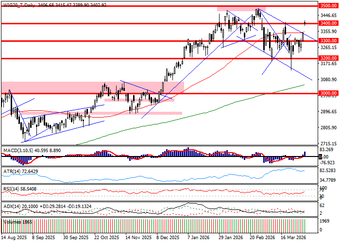 Sesja środowa na rynku warszawskim skończyła się mocnymi zwyżkami najważniejszych indeksów. WIG20 dodał 1,86 procent zbierając przeszło 1,99 miliarda złotych obrotu, gdy indeks szerokiego rynku WIG zyskał 1,73 procent przy obrocie zbliżonym do 2,47 miliarda złotych. Kluczowe znaczenie dla wyniku dnia miała wczorajsza zwyżka na Wall Street, gdzie indeksy odbiły dynamicznie w nadziei na zakończenie wojny na Bliskim Wschodzie. W istocie, WIG20 wystartował w sesję zwyżką o blisko 2 procent – przenosząc do Warszawy min. wzrost niemieckiego DAX-a o 2,8 procent – by finalnie zamknąć rozdanie niespełna 4 punkty niżej. Przez większą część sesji można było też mówić o oscylacji WIG20 wokół poziomu 3400 pkt., gdy pierwsze wymiany ulokowały indeks w rejonie 3407 pkt., a zamknięcie wypadło w rejonie 3403 pkt. Naprawdę sesja sprowadziła się do porannej luki i kilku godzin pilnowania wyniku oraz ruchów w korelacji z otoczeniem. Niemniej, szczególnie jasnym blaskiem świeciła spółka KGHM, która odpowiedziała na wczorajsze wzrosty metali i zyskała 7,35 procent. Po przeciwnej stronie grał Orlen, który operował w kontekście przeceny ropy i stracił 2,83 procent. Doskonale poradziły sobie spółki bankowe, których indeks WIG-Banki zyskał 3,21 procent niesiony na północ niemal trzyprocentowymi zwyżkami PKO BP i Pekao oraz wzrostem mBanku o 6,44 procent. Ciekawie po sesji prezentuje się sytuacja techniczna na wykresie WIG20, który luką połamał marcowy kanał spadkowy, ale wyhamował zwyżki w rejonie, gdzie wyczerpało się pierwsze odbicie po spadkach wywołanych wybuchem wojny na Bliskim Wschodzie. Na wykresie indeksu pojawiła się strefa oporów w rejonie 3415-3400 pkt., która musi zostać złamana, by indeks wrócił do gry o całkowite odrobienie marcowego spadku, test szczytu hossy i połamanie oporów w rejonie 3500 pkt. Nie ma jednak wątpliwości, iż klucz do szans byków i kontynuacji odbicia zachowały rynki bazowe i sytuacja na Bliskim Wschodzie.