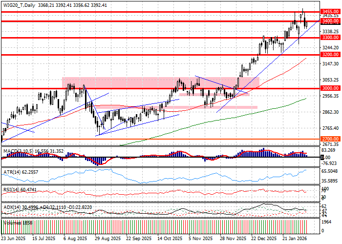 Finałowa sesja tygodnia na Giełdzie Papierów Wartościowych w Warszawie skończyła się zwyżkami najważniejszych indeksów. WIG20 wzrósł o 0,64 procent, gdy indeks szerokiego rynku WIG zyskał 0,50 procent. Obrót w koszyku blue chipów wyniósł 1,83 miliarda złotych, gdy na całym rynku przekroczył 2,23 miliarda złotych. Stabilizacje pojawiły się w gronie spółek o średniej oraz małej kapitalizacji i indeks mWIG40 wzrósł o 0,20 procent, gdy sWIG80 spadł o ledwie 0,04 procent. Wyciszenia poszukała też spółka KGHM, która wzrosła o 0,26 procent, co przekłada się na najskromniejszą zmianę procentową od przeszło dwóch tygodni. Stale, akcje KGHM były najmocniej granymi walorami w WIG20. Rolę lokomotywy byków pełnił dziś Orlen, który wzrósł o 3,50 procent. Razem z rynkiem grały spółki bankowe, których indeks WIG-Banki zyskał skromne 0,34 procent. W istocie, również zmianę koszyka WIG20 należy uznać za konsolidacyjną i próbę wyciszenia po wczorajszym spadku o 2,49 procent. Perspektywa techniczna potwierdza ten układ wykreśleniem świecy dziennej, która pozostaje w cieniu rozdania czwartkowego i wczorajszego ostrzeżenia przed korektą. W perspektywie tygodniowej rynek ugrał dziewiątą zwyżkę w serii, co oznacza, iż w tej perspektywie czasowej indeks WIG20 nie spadł od pierwszego tygodnia grudnia. Wzrost poszerzył też tegoroczną zwyżkę indeksu do 6,54 procent. Techniczna ocena wykresu tygodniowego nie pozostawia jednak wątpliwości, iż wyjścia WIG20 nad barierę 3400 pkt. owocują kontrami podaży, które nie pozwalają popytowi przełamać psychologicznego poziomu. Układ dzienny i tygodniowy solidarnie ostrzegają przed korektą, ale należy zakładać, iż kolejny krok rynku zostanie podyktowany przez szerokiego otoczenie, a więc mieszankę impulsów z rynków surowcowych z ropą i metalami na czele oraz postawy rynków bazowych w połączeniu z relacją złotego z dolarem.