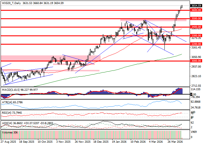 WIG20 wszedł w drugą godzinę sesji zwyżką o 0,6 procent, co przekłada się na położenie w rejonie 3660 pkt. Indeks kreśli nowy rekord hossy, co oznacza też zbliżenie się na około 40 punktów albo 1,1 procent od psychologicznej bariery 3700 pkt. Technicznie patrząc indeks kontynuuje ruch w ramach ostatniej fali wzrostowej, co oznacza powiększenie fali wzrostowej do blisko 17 procent. Ostatni element oznacza, iż rośnie lokalne wykupienie rynku i presja na realizację zysków po fali wzrostowej. W istocie, wskaźniki pozycjonują się już w strefach wykupienia, jak np. RSI w rejonie 74 pkt.