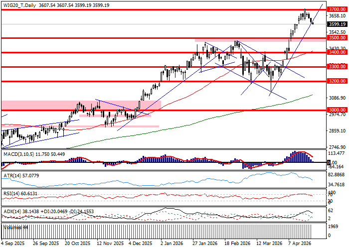 Pierwsze wymiany na rynku kasowym przekładają się na spadek WIG20 o 0,3 procent. W indeksie przecenia się 17 spółek. Na plan pierwszy wybija się zwyżka Pepco o przeszło 5 procent. Po stronie spółek przecenionych na pierwszym planie gra spółka KGHM spadająca o 1,9 procent. Razem z ropą rośną akcje PKN. Spadek WIG20 powiela cofnięcie niemieckiego DAX-a, więc ruch rynku można uznać za przeniesiony z otoczenia. Technicznie patrząc otwarcie luką rzuca indeks w rejon 3600 pkt., ale popyt kontruje podaż w rejonie pierwszego wsparcia. Wykres WIG20 stale gra też na granicy linii lokalnego trendu wzrostowego, więc za wcześnie mówić o przesileniu, które wymusi na popycie odsunięcie się w rejon 3500 pkt.