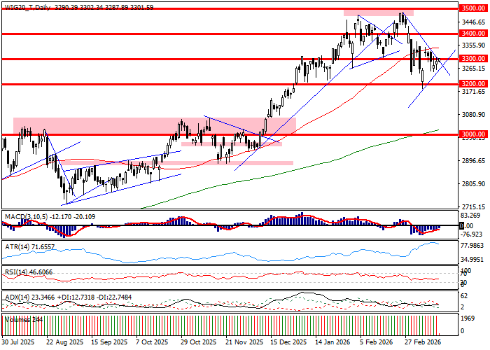 WIG20 skończył pierwszą godzinę sesji kosmetycznym przesunięciem wobec poziomu wczorajszego zamknięcia. Równie skromnie prezentuje się zmiana wobec poziomu otwarcia dzisiejszych notowań. Całość uzupełnia skromna zmienność, która owocuje rysowaniem drobnej szpulki przez wykres WIG20. Rynek pozostaje też w kontakcie z poziomem 3300 pkt., który jest poziomem równoważenia się podaży z popytem. Do odnotowania jest zwyżka PGE o 7,4 procent i wzrost PKN o 2,4 procent. Cieniem na rynku kładzie się wzrost cen ropy, który może pomagać Orlenowi, ale dla reszty rynku staje się ostrzeżeniem przed presją spadkową z otoczenia. Technicznie patrząc można mówić o konsolidacji w rejonie 3300 pkt.
