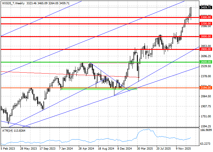 Środkowa faza sesji lokuje WIG20 w pobliżu porannego maksimum, co oznacza też położenie bliskie nowemu rekordowi hossy. Rozpiętość sesji pozostaje jednak relatywnie skromna na tle poprzednich rozdań i w sumie można mówić o rozdaniu konsolidacyjnym. Niemniej, połowa sesji środowej jest też połową tygodnia. W tej perspektywie patrząc popyt wygrywa nie tylko największą zwyżką tygodniową od początku stycznia, ale też dynamicznym białym korpusem, który neutralizuje – czy też równoważy - górny cień świecy z poprzedniego tygodnia. Dowiezienie tego obrazu do piątkowego zamknięcia będzie oznaczało sukces byków i przedłużenie hossy poza 3400 pkt. W praktyce, na radar rynku wejdzie 3500 pkt., do którego brakuje mniej niż 1,2 procent.