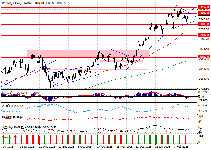 Pierwsze wymiany na rynku kasowym przekładają się na zwyżkę WIG20 o 0,4 procent. Na pierwszym planie lokuje się wzrost Orlen o 1,9 procent. Spółka walczy też o pierwszej miejsce pod względem aktywności z KGHM, której akcje przeceniają się o około 1 procent. Zwyżki szuka też Pekao. W przypadku PKN i PEO można mówić o pozytywnym przyjęciu przez rynek danych finansowych ze spółek. Na trzy spółki przypada połowa obrotu w WIG20. Technicznie patrząc otwarcie mieści się ciągle w konsolidacji, która przybiera kształt układu kontynuacyjnego. W istocie, otwarcie wzmacnia układ kolejną kontrą podaży na górnym ograniczeniu formacji trójkąta. Technicy muszą też odnotować kontrę sprzedających w rejonie 3400 pkt., która potwierdza wrażliwość rynku na równe poziomy oglądaną ostatnio przy kontrze popytu w rejonie 3300 pkt.