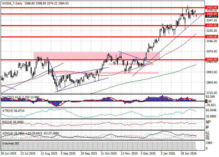 WIG20 wszedł w drugą godzinę notowań na poziomach kosmetycznie różnych od otwarcia. Indeks stale traci blisko 1 procent. Wykres WIG20 pokazuje, iż indeks rysuje kolejny drobny korpus, który podkreśla równowagę podaży z popytem w rejonie 3400 pkt. Analogicznie zachowuje się niemiecki DAX, który skonsolidował się w rejonie otwarcia przy kosmetycznej stracie. Zachowanie otoczenia jawi się jako zrozumiałe, gdy uwzględni się skupienie uwagi inwestorów na publikowanej dziś o 14:30 inflacji w USA. W szerszej perspektywie potarzać, stale można mówić o aktualnym położeniu DAX-a i WIG20 w znanych konsolidacjach.