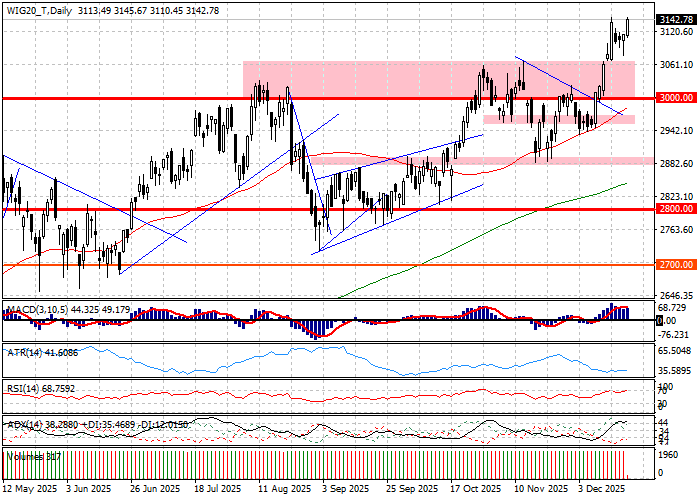 WIG20 skończył pierwszą godzinę sesji wymarszem w rejon 3145 pkt. i zwyżką o 0,8 procent. Częścią układu sił było wyjście w rejon 3145,67 pkt., co oznacza wyznaczenie nowego rekordu hossy. Naprawdę jednak poprzedni szczyt został wyrysowany w rejonie 3145,56 pkt., więc lepiej mówić o wyrównaniu rekordu. Dodatkowym elementem wymuszającym dystans do sukcesu byków jest zdominowane sesji przez kontrakty. W praktyce warto zachować nieco dystansu do siły rynku i zakładać, że trzeci piątek grudnia nie będzie pozbawiony standardowej dawki szumu technicznego.