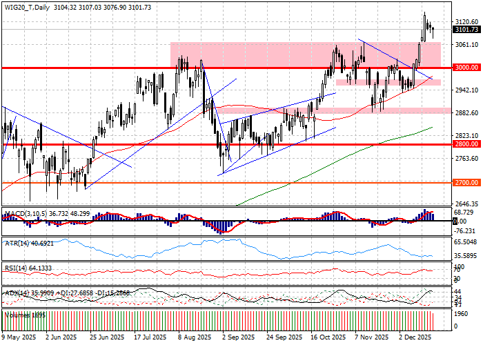 Poranek na Wall Street został zagrany w optymistycznym układzie sił. Niższe od oczekiwań odczyty inflacji – CPI 2,7 procent i CPI-Core 2,6 procent – połączyły się z reakcją na wyniki spółki Micron Technology, która produkuje podzespoły wykorzystywane w serwerach używanych na potrzeby sztucznej inteligencji. Efektem jest spadek rentowności długu, wzrost apetytu na ryzyko i ocieplenie klimatu wokół spółek technologicznych. W konsekwencji, Nasdaq Composite rośnie o 1,4 procent, gdy S&P500 zyskuje 1 procent przy zwyżce DJIA o 0,7 procent. Europa wpisuje się w ten układ sił lokowaniem indeksów na dziennych maksimach, co widać również na wykresie WIG20. Niemniej, indeks tylko wrócił w rejon 3100 pkt., a więc finał sesji jest grany w punkcie równowagi, gdzie WIG20 konsoliduje się od poranka sesji wtorkowej. Jutrzejszą sesję zdominuje rozliczenie grudniowej serii kontraktów. Standardowo, standardowy handel powinien wrócić w poniedziałek, ale tegoroczny układ świąt powoduje, iż realnie wiarygodny technicznie rynek może wrócić dopiero 7 stycznia.