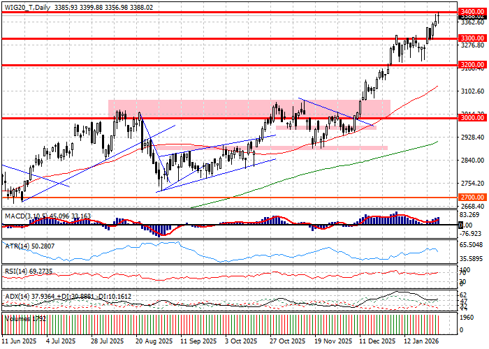 Pierwsza godzina sesji na Wall Street przyniosła spotkanie indeksu S&P500 z poziomem 7000 pkt. Indeks zameldował się nad psychologicznym oporem, ale po godzinie widać, iż popytowi nie udało się utrzymać średniej nad kluczową barierą. GPW zdążyła posilić się tym impulsem i WIG20 zameldował się w rejonie 3399,88 pkt. Spotkanie z psychologicznym oporem w rejonie 3400 pkt. jest już faktem. Niestety, kontra podaży na Wall Street owocuje również cofnięciem w Warszawie i WIG20 kończy sesję nie tylko wzmocnieniem oporu na 3400 pkt., ale też w konsolidacji pod psychologiczną barierą. Jutro warto liczyć z luką, którą rynek odpowie na impulsy wysłane na rynki przez Fed i prezesa Rezerwy Federalnej na konferencji po posiedzeniu FOMC.