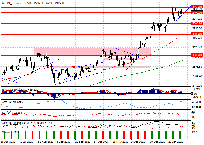 Pierwsza godzina sesji na Wall Street wskazuje, iż rynki amerykańskie nie potrafią utrzymać pierwszych reakcji na lepsze od oczekiwań odczyty z rynku pracy. Spadek stopy bezrobocia do 4,3 procent i wzrost liczby miejsc poza rolnictwem o 130 tys. zredukowały rynkowe zaniepokojenie ostatnimi danymi o planowych zwolnieniach w firmach, ale też obniżyły szanse na obniżki ceny kredytu przez Fed. W efekcie, kontrakty oddały całość zwyżek ugranych po 14:30, a S&P500 stale nie potrafi uporać się psychologicznym oporem na 7000 pkt. W przypadku rynków europejskich problemem staje się umocnieni dolara, który też zdaje się redukować pierwszą reakcję na dane z USA, ale pozostaje silniejszy do euro, jak i złotego. Pozytywem jest umocnienie surowców, które pozwala GPW podnosić ceny KGHM o blisko 5 procent i PKN o 2 procent, co przekłada się na zwyżkę WIG20 o 0,5 procent. Niestety, z perspektywy technicznej sesja pozostanie elementem ostatniej gry WIG20 w równowadze w rejonie 3400 pkt.