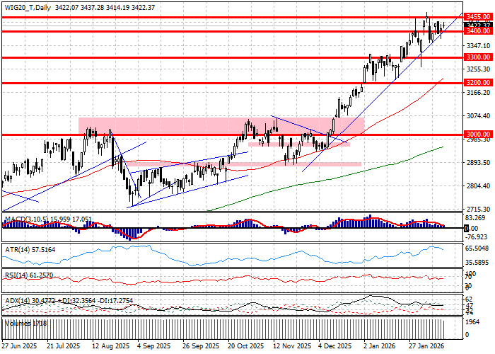 Pierwsza godzina sesji na Wall Street wskazuje, iż S&P500 stale nie potrafi zaatakować psychologicznej bariery 7000 pkt. Na rynkach widać znów podział na relatywnie silniejszego DJIA, który rośnie o 0,4 procent, gdy Nasdaq Composite spada o 0,3 procent. Szeroki S&P500 przedłuża wczorajszą konsolidację i notuje kosmetyczną zmianę. Brak mocnych impulsów ze strony rynków amerykańskich powoduje, iż GPW nie może wybić się z dzisiejszego wyciszenia, które owocuje kosmetyczną zwyżką WIG20 o 0,2 procent. Technicznie patrząc obraz sesji jest identyczny, jak o poranku – WIG20 konsoliduje się kreśląc skromną szpulkę, która podkreśla zawieszenie indeksu między szczytem hossy wyrysowanym pod psychologiczną barierą 3500 pkt. i pierwszymi wsparciami zalegającym w rejonie 3350 pkt.