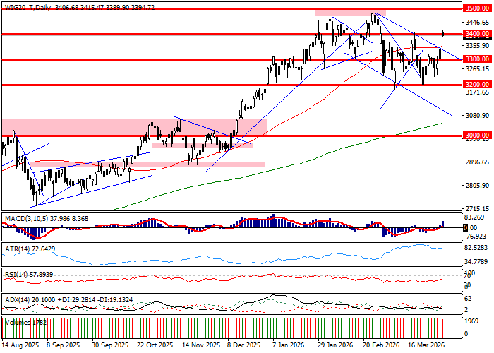 Pierwsza godzina handlu na Wall Street wskazuje, iż inwestorzy ciągle operują w kontekście nadziei, iż wojna na Bliskim Wschodzie dobiegnie końca. Popyt wspiera się zdaniami prezydenta USA, który wyraził gotowość do zawieszenia broni w wypadku otwarcia żeglugi przez Cieśninę Ormuz. Efektem są spadki cen ropy i zwyżki indeksów amerykańskich, co pozwala Europie utrzymywać wcześniejsze wzrosty. GPW wykorzystuje układ sił do stabilizacji WIG20 przy wzroście o 1,6 procent. Cieniem na rynku kładzie się spadek Orlenu, który oddaje 3,4 procent reagując na spadek cen ropy po przeszło 2 procent. Technicznie patrząc obraz rynku pozostaje taki sam, jak we wcześniejszych godzinach sesji. Aktualne pozostaje wybicie WIG20 na linię kanału spadkowego, ale wzmocnieniu ulega strefa oporów w rejonie 2415-2400 pkt.