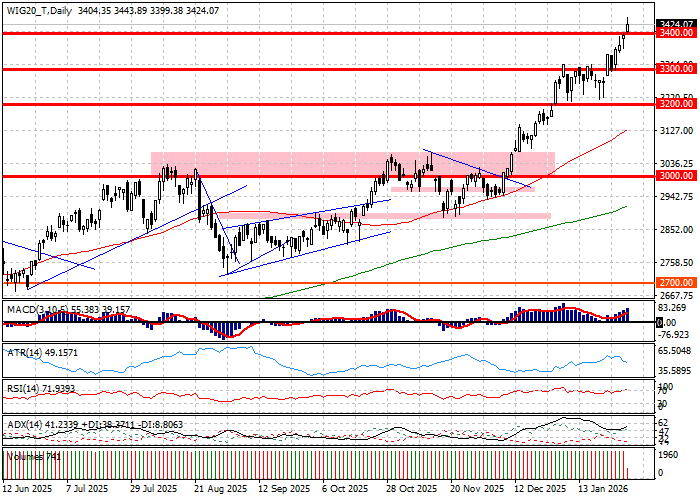 Środkowa faza sesji lokuje WIG20 w rejonie 3425 pkt. Zwyżka z poranka została zredukowana do +0,9 procent, więc stale można mówić o przewadze strony popytowej. Niemniej, kreślony górny cień świecy dziennej przypomina, iż pokonanie oporu na 3400 pkt. musi być dowiezione do końca sesji i dobrze, gdy zostało ugrane pozytywnym obrazem technicznym. W istocie, już teraz wybicie nad opór jest grane w kontekście sygnałów wykupienia rynku i wskaźników dywergujących z wykresem indeksu. Stale można też mówić o kontekście, w którym rynek szybuje na północ w oparciu o zwyżki cen surowców, gdy rynki bazowe, do których dołącza teraz złoty spadkiem do dolara, operują w kontekście presji ze strony podaży, gdyż DAX traci już 1,2 procent.