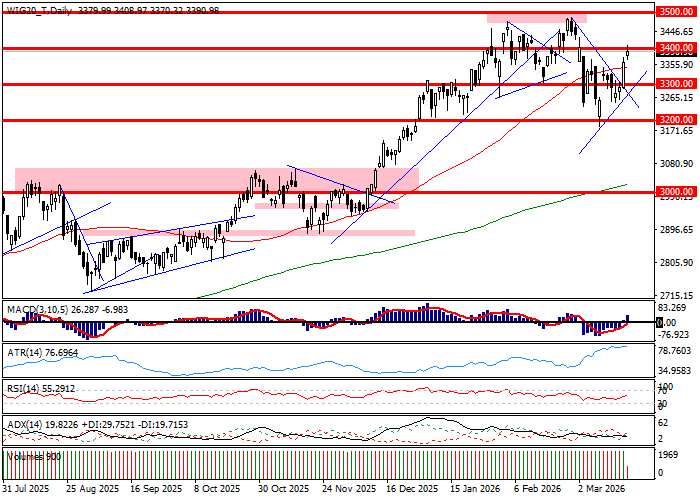 Środkowa faza sesji lokuje WIG20 w rejonie 3395 pkt. Indeks zredukował właśnie zwyżkę do 0,9 procent po impulsie spadkowym z otoczenia, które odpowiedziało na wzrost cen ropy. Kontrakt na ropę crude znalazł się ułamek od poziomu wczorajszego zamknięcia, co oznacza też możliwość odrobienia całości wcześniejszych spadków – o około 3 procent – które stały za nocnym optymizmem kontraktów na amerykańskie indeksy i wzrostami indeksów europejskich. Całość sumuje się w układ sił, w którym od GPW należy oczekiwać podtrzymania zależności od otoczenia i wyniku sesji podyktowanego przez zachowanie giełd bazowych.
