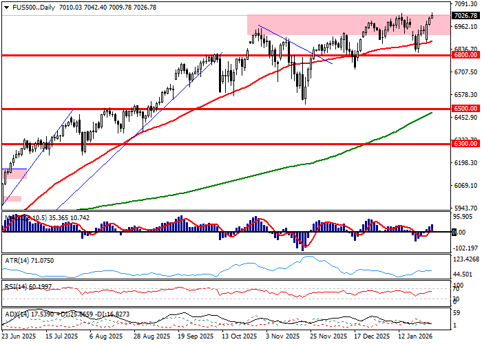 S&P500 wzrósł we wtorek o 0,41 procent. Zwyżki starczyło do wyznaczenia nowych ATH w perspektywie intraday i EoD, które zalegają teraz na – odpowiednio – 6988,82 pkt. i 6978,60 pkt. Licząc w procentach indeks znalazł się wczoraj ledwie 0,16 procent od psychologicznej bariery 7000 pkt. i dziś musi zyskać tylko 0,31 procent, by testować psychologiczny opór. Kontrakty wskazują, iż rynek kasowy zacznie sesje ułamek poniżej psychologicznej bariery, ale też – jak widać na wykresie CFD – pozycjonuje się pod wybicie indeksu bazowego na nowe ATH i zakończenie konsolidacji. Niemniej, na chwilę obecną rynek kasowy operuje ze stale aktualnym zadaniem pokonania bariery 7000 pkt., bez połamania której ruchy S&P500 pozostaną tylko grą z psychologicznym oporem. Stale poprawnie dla popytu prezentuje się układ na wskaźnikach, które przy poprzednim podejściu w rejon 7000 pkt. ostrzegały przed korektą dywergencjami, a dziś schłodzone podnoszą szanse byków na pokonanie psychologicznego oporu. Wykres CFD pokazuje też, iż podaż nie wykorzystała szansy związanej z połamaniem średniej z 50 sesji, więc momentum pozostaje wzrostowe.