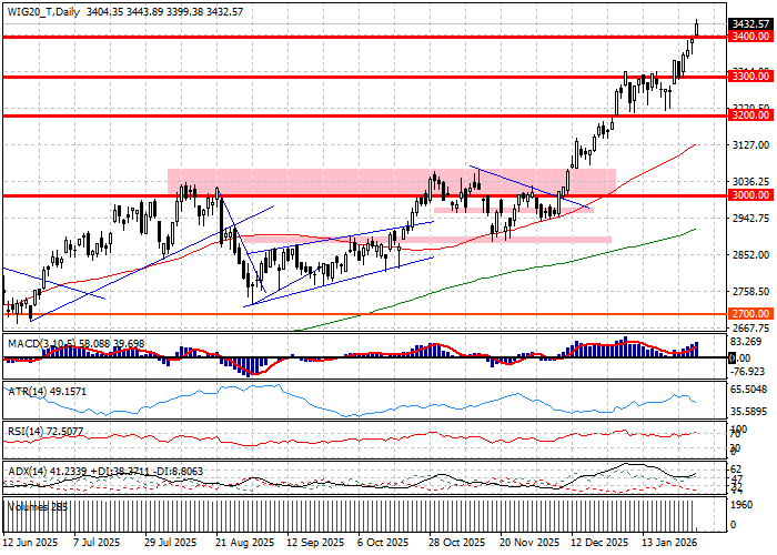 WIG20 skończył pierwszą godzinę sesji zwyżką zbliżoną do 1,3 procent. Na plan pierwszy wybijają się spółki surowcowe – KGHM rośnie o 9,5 procent przy zwyżce PKN o 3 procent. Na dwie spółki przypada też 345 milionów złotych obrotu, co daje przeszło połowę aktywności na całym rynku. Przy takich ciężkich walorach rosnących dynamicznie zrozumiała jest zwyżka WIG20, który lokuje się w rejonie 3438 pkt. i pod nowym maksimum hossy wyznaczonym w rejonie 3344 pkt. Wybicie nad opór w rejonie 3400 pkt. jest czytelne, więc zadanie byków zmienia się na grę o utrzymania wybicia do końca sesji. Problemem w tym układzie sił staje się wybranie przez rynek zmiennych w otoczeniu, które przesądzą o nastrojach w Warszawie. Solidarny wzrost surowców – metali i ropy – łączy się z umocnieniem złotego, co jest klasyczną mieszanką wzrostową dla GPW. Jednak spadek DAX-a o 0,7 procent i skromne zmiany amerykańskich futures indeksowych wskazują, iż rynek wyprzedza - przynajmniej częściowo - wydarzenia na świecie.