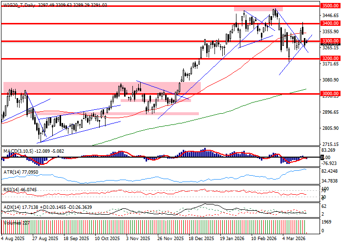 WIG20 kończy pierwszą godzinę sesji zredukowaniem procentowej zwyżki o połowę. Podaż na akcjach PKN przecenia spółkę o przeszło 0,8 procent, gdy zwyżka KGHM została obniżona do +1,1 procent. Stale błyszczą akcje CD Projekt, które zyskują 8,5 procent przy blisko 100 milionach złotych obrotu, gdy w WIG20 udało się ugrać 280 milionów złotych. Technicznie patrząc WIG20 spędził pierwszą godzinę oscylując wokół poziomu 3300 pkt. Zachowanie indeksu wpisuje się we wcześniejsze wskazania, iż rejon pozostaje miejscem, w którym podaż i popyt są w równowadze. Położenie jest neutralne technicznie i pozwala czekać na nowe impulsy oraz godzinę rozliczenia pochodnej.