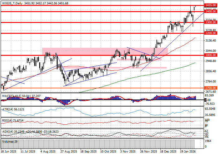 Pierwsze wymiany na rynku kasowym przełożyły się na zwyżkę WIG20 o ledwie 0,2 procent. Najuważniej obserwowana i najmocniej ostatnio grana spółka w indeksie – KGHM – spada o 0,1 procent i tradycyjnie zbiera największą część aktywności w koszyku WIG20. Próba wyciszenia na rynku surowcowym – miedz przesuwa się o ledwie 0,3 procent – wskazuje, iż lider ostatnich sesji może grać mniejszą rolę w trakcie dzisiejszego rozdania. Korekta wczorajszej siły pojawia się na spółkach bankowych i WIG-Banki spada o 0,3 procent po wczorajszej zwyżce o 4 procent. Wzrosty po przeszło 1 procent notują słabe wczoraj CDR Projekt i Orlen. Technicznie patrząc pierwsze minuty nie przynoszą przesilenia i opór w rejonie 3455 pkt. czeka na połamanie.