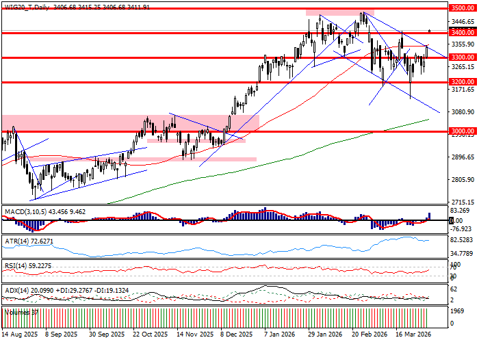 Pierwsze wymiany na rynku kasowym przekładają się na wzrost WIG20 o przeszło 2 procent. W indeksie drożeje 19 spółek przy samotnym spadku spółki Orlen, która reaguje cofnięciem o 0,8 procent na spadek cen ropy o 4 procent. Najmocniejszym walorem jest spółka KGHM, która drożeje o 4,7 procent i zbiera 30 procent aktywności rynku w WIG20. Otoczenie zaczyna w tym samym układzie sił i niemiecki DAX zyskuje imponujące 2,8 procent. Technicznie patrząc sesja zaczyna się wybiciem WIG20 z marcowego kanału spadkowego – co zapowiadał już kontrakt na WIG20 – i wyjściem nad poziom 3408 pkt. Ostatni element oznacza test oporu w rejonie, gdzie wyczerpała się pierwsza próba odreagowania odpowiedzi rynku na wybuch wojny na Bliskim Wschodzie. Stale należy zakładać, iż przyszłość odbicia zostanie przesądzona przez korelację GPW z otoczeniem.