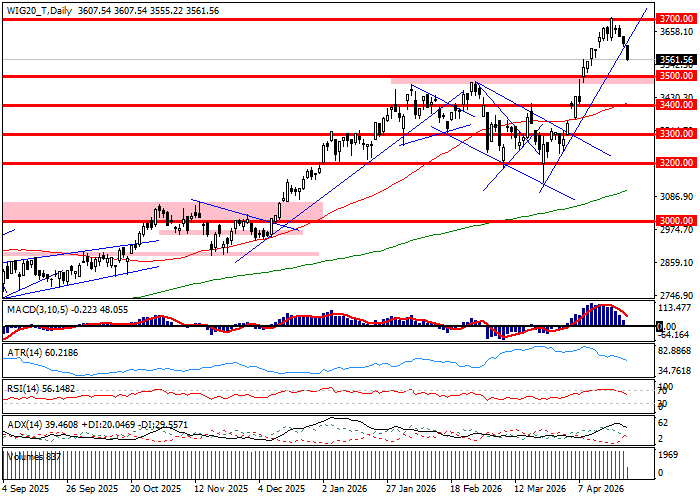 Środkowa faza sesji nie pozostawia wątpliwości, iż rynek jest dziś słabszy od otoczenia. Spadek WIG20 został poszerzony do 1,5 procent, gdy niemiecki DAX oddaje 0,6 procent, a futures na S&P500 tracą 0,4 procent. Z obowiązku należy odnotować, iż wszystkie elementy grają w podażowym obozie i spadki na rynkach bazowych rozumianych szeroko - od akcji przez surowce po waluty – zachęcają podaż do akcji, więc przecena jest stosunkowo łatwa do grania. Spojrzenie na wykres dzienny WIG20 pozwala odnotować czytelną odpowiedź rynku na przełamanie linii lokalnego trendu wzrostowego i ruch korekcyjny, który zaprasza do spoglądania w rejon 3500 pkt. W efekcie, również układ techniczny wspiera podaż.