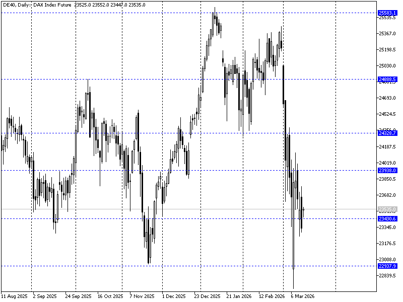 Początek tygodnia na globalnych rynkach jest neutralny, jednak w dalszym ciągu wyczuwalne jest napięcie geopolityczne rzutujące na dużą zmienność cen ropy. Z jednej strony weekend przyniósł serię wypowiedzi Trumpa (Boots on the ground w Iranie, prośby do członków NATO o pomoc w odblokowaniu cieśniny, grożenie członkom NATO etc). Skutkiem jest lekkie podbicie notowań cen ropy (blisko 100 USD na WTI). Z drugiej strony brak jest umocnienia USD sugerującego skokowe risk-off. Ponadto w tle obserwujemy podbicie presji na Tajwan ze strony Chin. W środowisku tym otrzymujemy dość neutralne kwotowania futures na DAX'a, w ramach wcześniejszej, szerokiej konsolidacji. Kluczowa strefa wsparcia to okolice 23k pkt.