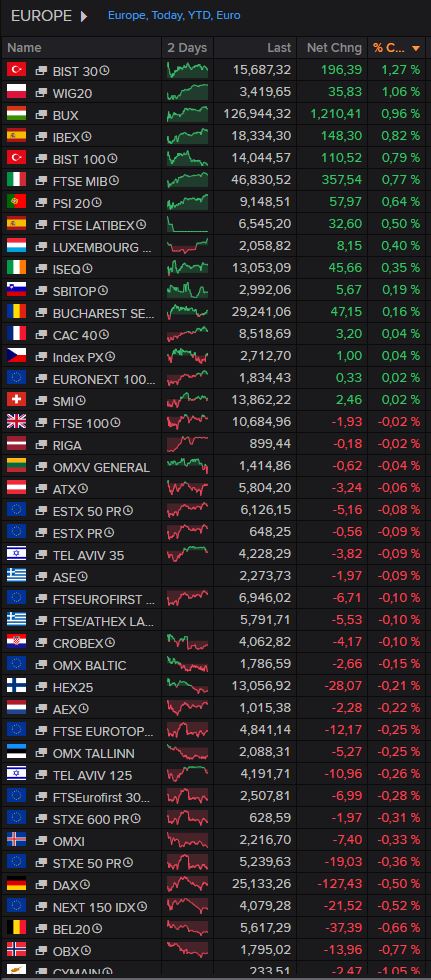 Minęła godz. 12:00, a krajowy rynek powiększa zwyżkę do ok. 1,06%, notując 3419 pkt na WIG20. Tym samym jesteśmy jednym z najmocniejszych parkietów w Europie (tabela). Warto jednak pamiętać iż skala zmian jest dziś relatywnie niska. W WIG20 warto wspomnieć o blisko 2,5% wzroście akcji Dino, 2,2% na KGHM (zwyżka futures na srebro) czy 2,1% odreagowania na Allegro. Na szerokim rynku obserwujemy ponad 5% podbicie walorów JSW.