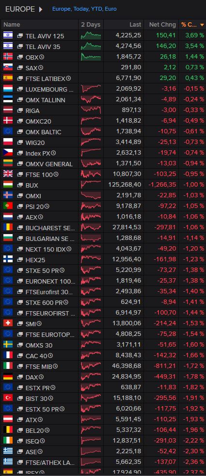 Minęła godzina 12:00 a sytuacja rynkowa pozostaje ostrożna. Tąpnięcia z otwarć notowań zostały wybronione, nastąpiło odbicie, jednak aktualnie trwa analiza dalszych scenariuszy. Kolejne raporty i depesze sugerują trwające wymiany ognia. Oficjalnie podawane jest coraz więcej faktów (m.in. strącenie omyłkowo trzech F-15 przez Kuwejt). Nie wiadomo czy Francja, Niemcy czy UK dołączą do ataków na Iran (na co napierają USA). Ropa pozostaje na ok. 7% plusach. W Europie dominują ok. 1,5-2% spadki. Co ciekawe parkeit w Tel Avivie jest na na blisko 4% plusach.