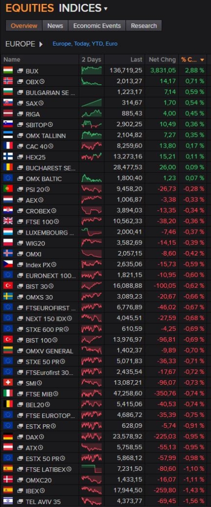 Minęła godz. 12:00, a układ rynkowy nie uległ większej zmianie. WIG20 pozostaje niedaleko punktu odniesienia z piątku (0,4% spadku). DAX traci mniej niż 1%, a wycena ropy naftowej nie zmieniła się znacząco wobec wyższego otwarcia (okolice 104-105 USD na WTI). Rynek ponownie próbuje wyceniać scenariusz wyższych cen nośników energii (Blokada Ormuzu ze strony USA) co z kolei podbija rentowności długu, gdzie inwestorzy znów muszą dyskontować scenariusz ewentualnych podwyżek stóp. W Europie wyraźnie na plus wyróżnia się węgierski BUX notujący ok. 3% zwyżki, pozostałe benchmarki notują nieznacznie spadki.