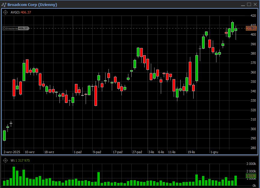 Broadcom prognozuje przychody za I kwartał powyżej oczekiwań rynku, jednak ostrzegł, że marże spadną z powodu rosnącego udziału przychodów z AI. Spółka posiada backlog o wartości 73 mld USD na najbliższe 18 miesięcy, ale spodziewa się spadku marży brutto o około 100 pb kwartał do kwartału.