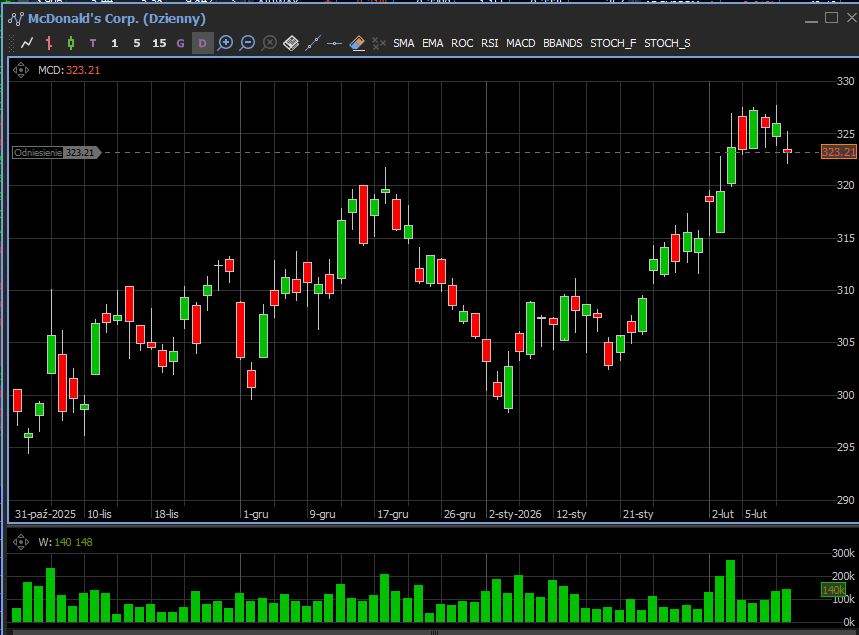 McDonald’s przebił oczekiwania Wall Street w zakresie globalnej sprzedaży porównywalnej i zysku za IV kwartał. Globalne same-store sales wzrosły o 5,7% wobec oczekiwanych 3,7%, a skorygowany EPS wyniósł 3,12 USD wobec prognoz 3,05 USD. Spółka wskazała, że strategia promocyjna i oferta value skutecznie przyciągają klientów o niższych dochodach.
