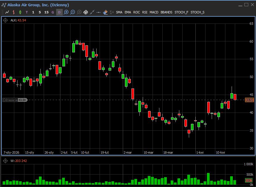 Linia lotnicza wycofała prognozę zysku na cały rok po gwałtownym wzroście kosztów paliwa związanych z wojną w Iranie. Spółka oczekuje wzrostu rachunków za paliwo o około 600 mln USD w drugim kwartale, co oznacza presję na EPS rzędu 3,60 USD. Odnotowała skorygowaną stratę 1,68 USD na akcję za kwartał zakończony 31 marca wobec oczekiwań analityków na poziomie 1,35 USD straty na akcję, przychody operacyjne wyniosły 3,3 mld USD zgodnie z prognozami Wall Street.