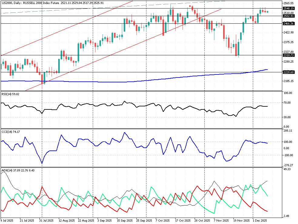 Z punktu widzenia techniki futures na S&P 500 pozostają w układzie pro-wzrostowym po październikowo - listopadowej korekcie, a główny trend w średnim terminie nadal można definiować jako wzrostowy. Krótkoterminowo rynek balansuje w pobliżu lokalnych oporów wyznaczonych przez ostatnie szczyty z początku grudnia przy ok. 6879 – 6924 pkt., natomiast RSI (14) oscyluje w strefie umiarkowanej siły, sugerując raczej „schłodzenie” niż przegrzanie rynku. Z kolei ważne wsparcie wypada przy 6544 pkt. a jego nadbicie powinno wiązać się ze skokowo zwiększonym ryzykiem. Z kolei pochodna szerokiego Russella 2000 (US2000) po ostatnim odbiciu z okolic HL 2466 pkt. porusza się w strukturze typowej dla wczesnej fazy rynku byka, gdyż SMA-200 rośnie dopiero od ok. 50 sesji. Średnie krótkoterminowe zaczynają zawijać się w górę, a układ długoterminowy poprawia się zgodnie z klasycznymi modelami trendowymi. Wskaźniki impetu sygnalizują wyraźną poprawę sentymentu do segmentu małych spółek. Po decyzji Fed futures na Russell 2000 powinny wyraźnie nawiązać do świeżego statystycznie układu. Kluczowym wsparciem pozostaje rejon 2310 pkt., natomiast istotny opór przebiega przy 2540 punktów.