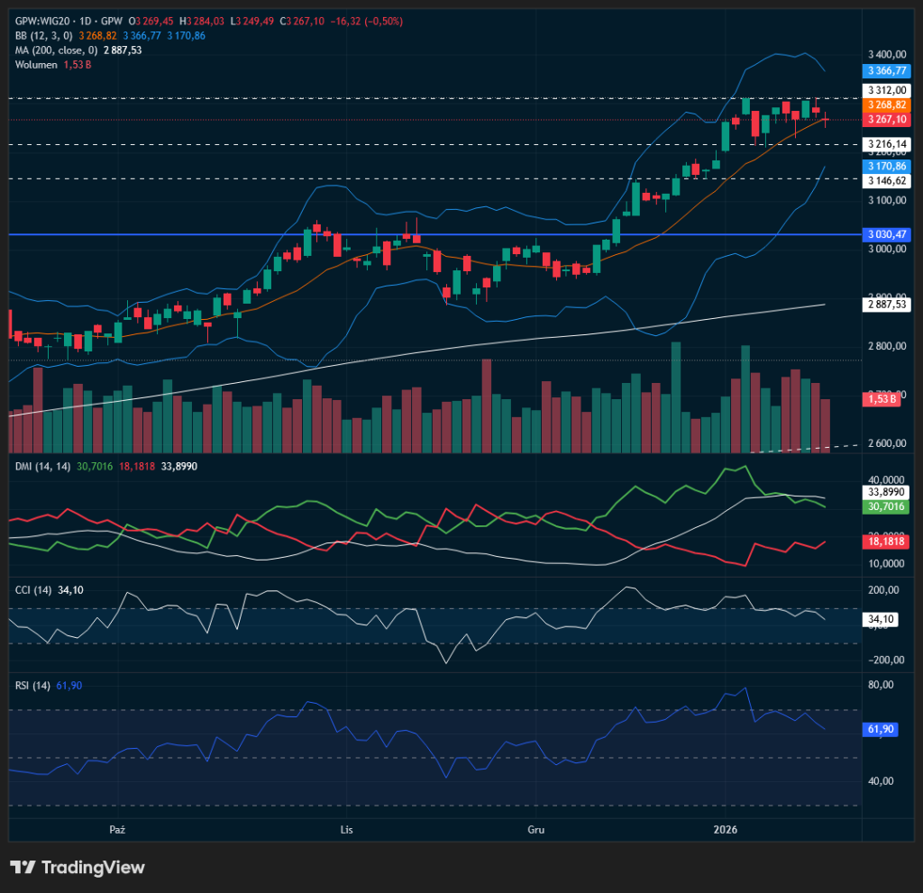 Pierwsza sesja nowego tygodnia na globalnych rynkach mijała pod znakiem umiarkowanej aktywności. W praktyce poniedziałek był dniem wolnym od obrotu kasowego w USA (Święto Martina Luthera Kinga), co tłumiło także wymiany w Eurolandzie. Początkowo wpływ miały nowe groźby prezydenta USA Donalda Trumpa dot. wprowadzenia ceł na osiem europejskich państw NATO w sporze o Grenlandię. „Straszaki” Trumpa mocno zaciążyły dziś na globalnych rynkach i przełożyły się również na nastroje przy Książęcej. W Europie indeks DAX spadał poniżej psychologicznej bariery 25 000 pkt., kończąc dzień wynikiem -1,34% w okolicach 24 958 pkt., co znacząco ograniczyło apetyt na ryzyko w całym regionie.