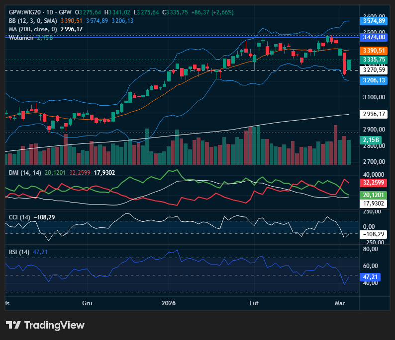 Technicznie WIG20 wykonał mocną świecę popytową quasi przenikania hossy z odbiciem od dolnej wstęgi Bollingera (ok. 3206 - 3270 pkt.) i powrotem nad 3300 pkt., jednak RSI(14) dopiero podniósł się do 47 pkt., a CCI(14) nadal przebywa poniżej –100 pkt., co sugeruje, że jest to odbicie korekcyjne, a nie jeszcze strukturalne przełamanie w kierunku nowej fali hossy. Kluczowy pozostaje opór 3390–3400 pkt. – jego wybicie otworzyłoby drogę do retestu lutowych szczytów przy ok. 3500 pkt., natomiast utrata 3270 pkt. zawróci rynek do scenariusza niepewności. Podsumowując dzisiejsza sesja to mocna próba odbudowy równowagi po geopolitycznym szoku, oparta na sektorach surowcowym, paliwowym i bankowym, ale to jeszcze nie jest nowa odsłona hossy – to dopiero „okno oddechu”, które musi zostać potwierdzone na wykresie i w globalnych nagłówkach z Bliskiego Wschodu.