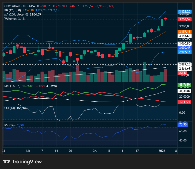 Notowania poniedziałkowe na rynku warszawskim skończyły się umiarkowanymi zmianami najważniejszych indeksów. WIG20 stracił 0,12 procent, gdy indeks szerokiego rynku WIG wzrósł o 0,13 procent. Dodatnie zmiany w rytm hossy pokazała druga linia i mWIG40 wzrósł o 0,73 procent, gdy sWIG80 wykazał się relatywną siłą i wzrostem aż o 1,01 procent. Obrót w koszyku blue chipów przekroczył 2,12 miliarda złotych, gdy na całym rynku udało się ugrać blisko 2,55 miliarda złotych. Relatywna słabość WIG20 na tle giełd Eurolandu została zbudowana w części na postawie banków (Wig-Banki -0,43%) i spółek PKN (-1,5%), PZU (-0,5%), ZAB (-0,9%). Na pierwszy plan wybiła się spółka KGHM, którą obrócono na sumę przeszło 377 milionów złotych, przy umocnieniu o 4,59 procent. Wynik sesji jawi się jako remis między popytem a podażą, choć dzisiejsza świeca jest nieco bliższa formacji gwiazdy wieczornej niż Doji. Trzeba odnotować, że byki „twardo” broniły dzisiaj swoich racji, ale także rynki bazowe wyraźnie pomagały graczom, operującym na GPW. Tym samym byki powinny dominować nad stroną sprzedającą w kontekście widocznego, aktualnego sygnału kupna na DMI / ADX. Niemniej ww. formacji gwiazdy wieczornej daje do myślenia i włączania podejścia ostrożnościowego. Inwestorzy zostawili sobie sporo przestrzeni pod dalsze reakcje, gdyż jutro mamy w kraju Święto, więc przyjdzie nam reagować dopiero na środowym otwarciu. Co więcej część kapitałów powinna pozycjonować się pod dane z rynku pracy w USA, które ujrzą światło dzienne pod koniec tygodnia. Globalnie dominuje narracja „złe dane to dobre dane”. Słabszy odczyt przemysłowego ISM z USA utwierdził graczy w przekonaniu, że Fed pozostanie gołębi, co napędza manię na spółki technologiczne i AI (Nvidia, Micron). Inwestorzy wierzą, że cykl technologiczny jest silniejszy niż spowolnienie w przemyśle. Z technicznego punktu widzenia sytuacja robi się ciekawa – na wykresie WIG20 uformowała się podażowa formacja gwiazdy wieczornej. Pojawia się ona po wspomnianym, imponującym, 13-procentowym wzroście trwającym 42 sesje, co istotnie zwiększa ryzyko korekty. Bykom nie udało się sforsować szerokiej strefy oporu 3278 – 3295 pkt., a kluczowym wsparciem pozostaje teraz linia trendu na poziomie 3180 pkt. Jej przełamanie otworzy niedźwiedziom drogę do strefy 3150 – 3146 pkt. Zauważmy również, że inwestorzy zachowują spokój pomimo niepewnej sytuacji. Aresztowanie prezydenta Wenezueli N. Maduro przez Stany Zjednoczone prawdopodobnie nie będzie miało żadnych znaczących krótkoterminowych konsekwencji ekonomicznych dla gospodarki światowej, stąd brak trwałego zaostrzenia ryzyka wyzwolił byki spod wskazanej presji. Jednak reperkusje polityczne i geopolityczne będą się utrzymywać, więc warto czytać rynek w nieco bardziej ostrożnościowym stylu.