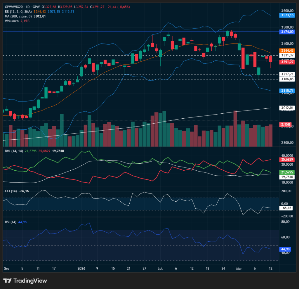 Z punktu widzenia techniki, WIG20 narysował na wykresie dziennym świecę z długim dolnym cieniem, co sugeruje próbę obrony mini-bazy 3258 – 3250 pkt. przed całkowitą kapitulacją, jednak wymowa sesji pozostaje niedźwiedzia. Indeks fluktuuje wyraźnie poniżej krótkoterminowej średniej SMA-20 (3344 pkt.), która z poziomu wsparcia przeobraziła się w twardy opór. Niepokoić może układ wskaźników trendu: -DI (35,68 pkt.) utrzymuje bezpieczną przewagę nad +DI (21,57 pkt.), co przy rosnącym ADX potwierdza, że momentum spadkowe przybiera na sile. Sygnalna RSI na poziomie 44,98 pkt. zostawia jeszcze sporo miejsca do ewentualnej zniżki, zanim rynek zostanie uznany za wyprzedany. Kluczowym bastionem dla byków pozostaje teraz psychologiczna bariera 3200 pkt. oraz długoterminowa średnia SMA-200 (3012 pkt.) – ich utrzymanie będzie warunkiem koniecznym do uniknięcia głębszej, wiosennej korekty na rynkach wschodzących, które mocno ucierpiały przez globalną niechęć do ryzyka.