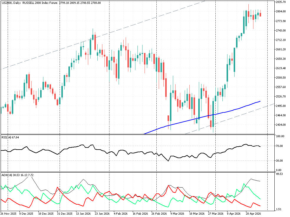 Główna pochodna na Russell 2000 wygląda słabiej relatywnie – po odbiciu z okolic 2418 pkt kurs dotarł pod 2828 pkt, gdzie zaczyna tracić impet, a RSI (~66) i słabnący ADX wskazują na wygasanie momentum. Price action sugeruje konsolidację pod oporem, co można interpretować jako fazę LPSY w schemacie Wyckoffa, czyli dystrybucję po wcześniejszym ruchu wzrostowym. W efekcie rynek futures wchodzi w klasyczną fazę „pause at the top” – trend pozostaje wzrostowy, ale krótkoterminowo rośnie znaczenie makro i wyników, które zdecydują, czy zobaczymy kontynuację ruchu powyżej 2800 pkt, czy głębsze schłodzenie.