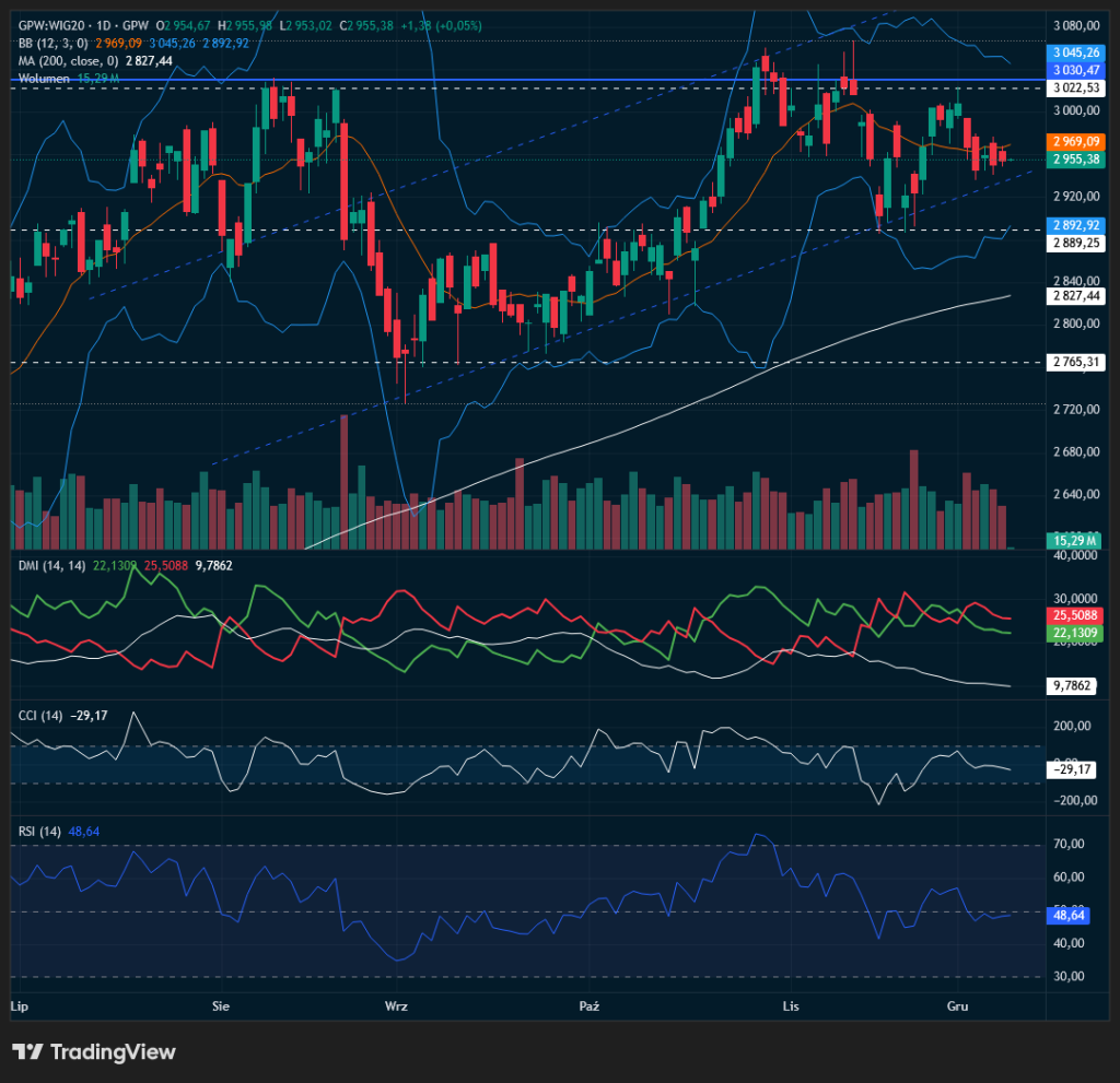Europa zaczyna sesję od stonowanej korekty wzrostowej z uwagi na podbicia głównych futures nowojorskich indeksów. Frankfurcki DAX zyskuje +0,29%, przy +0,18% na CAC40. Z kolei Wig20 rośnie o +0,11%. Pierwsze takty generują na poziomie licznika Wig20 ok. 28 mln zł obrotów, z czego 13 mln wnosi handel walorami KGH (-2,3%) i ALE (+0,03%). Technicznie patrząc mamy zachowane status quo dla zależności bocznej Wig20, więc kreślenie trendu bocznego 2976 – 2935 pkt. nie stanowi zaskoczenia. Natomiast wybicie się z tego zakresu powinno dać wstęp dla nowej fali kierunkowej, która i tak będzie potrzebowała ilościowego potwierdzenia ze strony twardych danych oraz zwiększonej aktywności. Ponadto wyższe czasowo ramy podtrzymują układ hossy na większości blue chips z GPW. Wskaźnikowo mamy podtrzymaną konsolidację i fazę marazmu, wyczekiwania na impuls cenotwórczy.