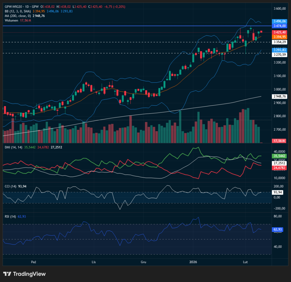 Indeks największych spółek notuje po wtorkowym otwarciu -0,2%, natomiast licznik obrotów wskazuje obniżone 27 mln zł obrotów. Widać zatem skłonność do skonsumowania części wczorajszych zysków, nawet po ostatniej relatywnie dobrej postawie Wall St. O poranku mamy aktywne wymiany na KGH (-2,09%), gdzie testowane są rejony 314,40 – 313,60 zł. Czytelnie technicznie wyróżnia się także walor ALLEGRO, który jest dzisiaj na starcie sesji najsilniejszy w Wig20, zyskując blisko 1 procent. Notowania Wig20 nadal pozostają jednak w konsolidacji 3474 – 3354 punktów, a płaskie zmiany -0,25%/+0,36% głównych, europejskich indeksów pozwalają graczom z GPW na wyczekiwanie na ważne dane makro oraz na wyniki finansowe dużych spółek z Niemiec i USA.