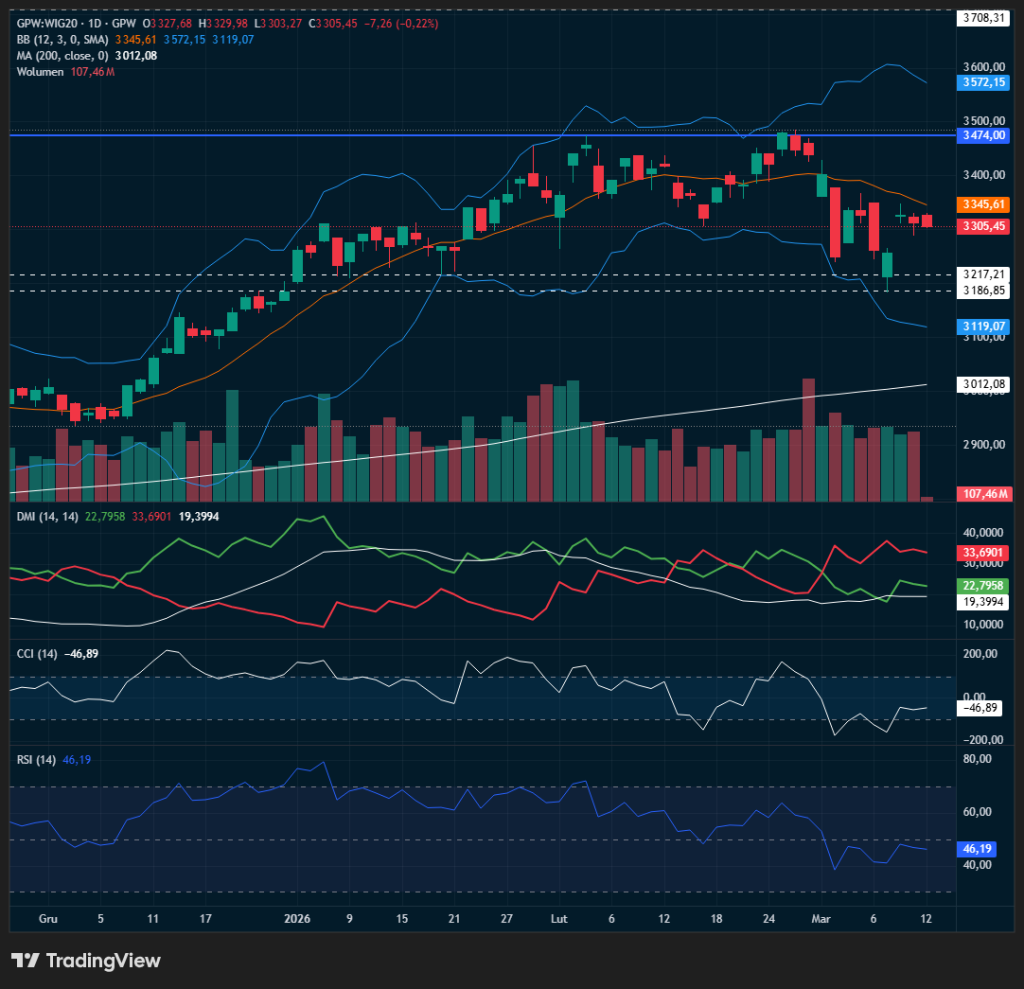 Relatywna siła polskiego indeksu wynika z unikalnego na tle Europy Zachodniej miksu sektorowego: podczas gdy DAX cierpi z powodu ekspozycji przemysłu na koszty energii, WIG20 jest dziś stabilizowany przez Orlen i KGHM, które działają jako naturalny hedge surowcowy przy drożejącej ropie i miedzi. Dodatkowym buforem jest sektor bankowy, który wciąż dyskontuje scenariusz „soft landing" i wsparcie płynnościowe po ostatnich decyzjach RPP, co ogranicza skalę przeceny mimo globalnego wzrostu rentowności. Warto jednak zachować ostrożność – indeks stracił już 8,5% od ostatnich maksimów, co pokazuje, że presja podażowa jest realna, a dzisiejsze odbicie może mieć charakter technicznego odreagowania, a nie trwałej zmiany trendu. Technicznie obraz pozostaje niedźwiedzi: kurs poniżej mediany Bollingera (3345 pkt.), CCI na -46,89, a układ DMI z czerwoną linią powyżej zielonej jednoznacznie wskazuje na dominację podaży – kluczowe wsparcie w strefie 3186-3217 pkt. pozostaje realnym celem przy powrocie negatywnych nagłówków z Bliskiego Wschodu.