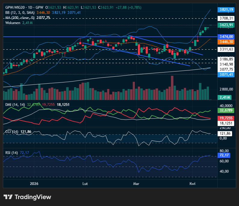 Otwarcie wtorkowej sesji na GPW przynosi umiarkowanie pozytywny sentyment, wspierany przez wcześniejsze wzrosty na Wall Street i dobre nastroje w Azji, choć w tle nadal pozostaje temat napięć na linii USA–Iran i wysokich cen surowców. WIG20 rośnie na starcie o ok. 0,8% do 3623 pkt, kontynuując ruch w kierunku kluczowej strefy oporu przy 3700–3820 pkt, wyznaczanej przez górne ograniczenie Bollingera. Technicznie indeks pozostaje w krótkoterminowym trendzie wzrostowym, utrzymując się wyraźnie powyżej średniej SMA-200 (3077 pkt) i środkowej linii BB (3446 pkt), choć RSI na poziomie 72,17 sygnalizuje już wykupienie rynku. Struktura wzrostów jest relatywnie szeroka – na starcie zyskują m.in. KGHM (+1,7%), Pekao (+1,17%), PKO BP (+1,15%) czy Budimex (+1,42%), co wspiera indeks od strony największych komponentów. Słabiej zachowuje się Orlen (-1,16%), który ogranicza skalę wzrostu WIG20, ale nie zmienia ogólnego obrazu przewagi popytu. Wskaźniki kierunkowe (DMI) pozostają po stronie kupujących, przy rosnącym +DI (32,68), choć relatywnie niski ADX (~18) wskazuje, że trend dopiero nabiera siły. Krótkoterminowo scenariuszem bazowym pozostaje próba ataku na 3700 pkt, jednak przy tak rozgrzanych wskaźnikach nie można wykluczyć chwilowego cofnięcia lub konsolidacji w trakcie sesji.