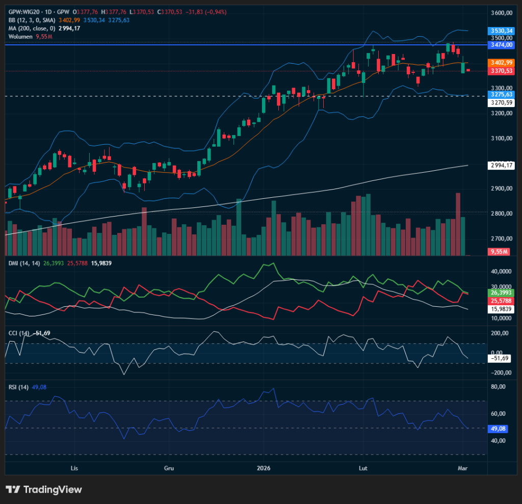 Indeks największych spółek z GPW traci o poranku blisko -1,0% (WIG20 ok. 3370 pkt.), co wpisuje się w pesymistyczny scenariusz nakreślony przez poranne wskazania futures i czerwoną sesję w Azji. Pierwsze wymiany generują podbity obrót, niestandardowo rozłożony na głównych komponentach, gdzie widać silną presję na KGHM (-2,33%), PKO BP (-0,92%) oraz Pekao (-1,5%), przy jednoczesnej próbie stabilizacji PKN Orlen (+0,05% przy 16 mln zł obrotów), który jako jedyny broni się przed głębszą przeceną dzięki rajdowi cen ropy. Frankfurcki DAX traci ponad 1,6%, a korekta spadkowa w Eurolandzie nabiera siły, reagując na zapowiedzi Donalda Trumpa o „wielkiej fali” ataków na Iran, co drastycznie podnosi premię za ryzyko geopolityczne. Sytuacja techniczna WIG20 na wykresie dziennym wskazuje, że dopóki strefa wsparcia 3362 – 3350 pkt. (lokalne minima) pozostaje nienaruszona, ruch ma wciąż charakter „kontrolowanego schłodzenia” po wcześniejszej hossie. Złamanie tych okolic otworzy jednak drogę do testu psychologicznej bariery 3300 pkt. oraz kluczowego węzła 3275 – 3270 pkt., gdzie przebiega dolna wstęga Bollingera i istotne wsparcie horyzontalne. Wskaźniki RSI(14) i CCI(14) dynamicznie zawróciły w dół, przy czym CCI przeciął linię zero od góry, co potwierdza wygasanie popytowego momentum i przejście w fazę korekcyjną. Średnia SMA-200 systematycznie rośnie i wypada obecnie przy 2994 pkt., co w szerszym interwale definiuje obecne spadki jako klasyczną korektę w silnym trendzie wzrostowym. Byki muszą teraz powalczyć o utrzymanie poziomu TL 3350 pkt., aby spróbować odchylić w górę sygnalną CCI i uniknąć głębszego przesilenia zniżkującego, które mogłoby sprowadzić indeks w rejon 3200 pkt. w przypadku dalszej eskalacji na linii Waszyngton–Teheran.