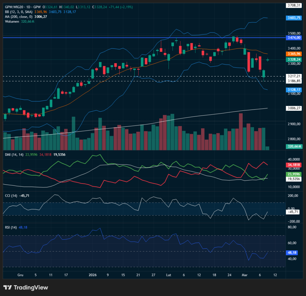 Pierwsza godzina handlu na warszawskim parkiecie przyniosła jednoznaczne potwierdzenie, że globalne „odbicie ulgi" po komentarzach Trumpa dotarło nad Wisłę z pełną siłą. WIG20 utrzymuje wzrost na poziomie +2,1% przy imponujących obrotach 346 mln zł, co oznacza, że w ciągu zaledwie 60 minut przez indeks blue chipów przepłynęło niemal czterokrotnie więcej kapitału niż sygnalizowały pierwsze minuty sesji. Ropa WTI i Brent tracą po ponad 7%, a europejski gaz TTF nurkuje o 15% do 48 EUR/MWh – to właśnie te dwa sygnały z rynku surowcowego napędzają dziś popyt na akcje w całej Europie, gdzie futures na DAX, CAC 40 i Euro Stoxx 50 rosną od 1,3% do 2,4%. Liderem obrotów i wzrostów pozostaje KGHM, który z wynikiem +4,15% i obrotem ponad 61 mln zł wyraźnie przyspieszył względem pierwszych minut sesji, gdy zwyżkował o ok. 4,0% przy znacznie niższej płynności. Sektor bankowy potwierdza swoją siłę w pełnym składzie – PKO BP utrzymuje wzrost +3,78% przy 44 mln zł obrotu, PEKAO zyskuje +3,42%, mBank +4,01%, a Alior +3,27%, co pokazuje, że kapitał napływa szerokim strumieniem, a nie jedynie do wybranych tickerów. Pozytywnie zaskakuje Santander Polska ze wzrostem +3,56%, który w pierwszych minutach był wyraźnie słabszy od reszty sektora. Jedynym wyłomem w obrazie powszechnej hossy pozostaje PKN Orlen, który jako spółka paliwowa traci -0,34% – paradoksalnie to właśnie gwałtowny spadek cen ropy, który napędza resztę rynku, uderza w marże rafineryjne i wycenę krajowego giganta energetycznego. Technicznie WIG20 dynamicznie wychodzi ponad strefę wsparcia 3186–3217 pkt, a RSI(14) poprawił się do 48 pkt., zaś CCI(14) z ekstremalnych wartości poniżej -150 odbił do -45 punktów, sygnalizując wychodzenie rynku z fazy paniki. Wolumen po pierwszej godzinie jest na tyle wysoki, że można mówić o realnej akumulacji pozycji przez instytucje, a nie jedynie o technicznym domykaniu krótkich pozycji. Rynek wyraźnie dyskontuje scenariusz rychłego odblokowania Cieśniny Ormuz, choć warto powstrzymać się przed nadmiernym optymizmem, gdyż obecna sytuacja różni się fundamentalnie od poprzednich epizodów napięć na Bliskim Wschodzie. Kluczowym testem dla trwałości dzisiejszego ruchu będzie utrzymanie WIG20 powyżej 3 300 pkt. do zamknięcia sesji oraz jutrzejsze dane CPI z USA, które ostatecznie zweryfikują, czy rynki słusznie odetchnęły z ulgą.