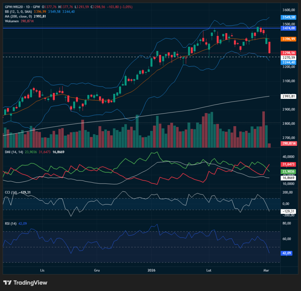 WIG20 po pierwszych 60 minutach handlu traci już blisko 3,1%, a licznik obrotów eksplodował do bardzo wysokich 413 mln zł, co jednoznacznie wskazuje na paniczne rotacje i wymuszone redukcje pozycji wśród głównych komponentów indeksu. Rozbicie strefy 3350–3362 pkt. odbyło się bez większej obrony, a rynek błyskawicznie zsunął się w okolice okrągłej bariery 3300 pkt., wokół której toczy się teraz nerwowa walka o krótkoterminową stabilizację. Technicznie poziom 3300 pkt. to nie tylko psychologiczna granica, ale również pierwszy lokalny punkt zaczepienia wynikający z dolnych projekcji Bollingera – jego utrata otworzyłaby drogę do zejścia w stronę 3270–3245 pkt., gdzie przebiega kolejna strefa popytowa. CCI(14) zanurkował w rejony –130 pkt., a RSI(14) spadł w okolice 42 pkt., co potwierdza słabnięcie momentum i klasyczny charakter fali wyprzedażowej napędzanej emocją, a nie jeszcze strukturalnym załamaniem trendu. Z punktu widzenia DMI/ADX widać przyspieszające wybicie -DI nad +DI przy rosnącym ADX, co oznacza, że presja podażowa nabiera cech ruchu kierunkowego, a nie jedynie chwilowego impulsu. Złamany został także intradayowy bias wzrostowy, a powrót powyżej 3350 pkt. byłby warunkiem minimalnym, by w ogóle mówić o hamowaniu „zjazdu”. Obecna struktura świec wskazuje na dominację podaży, jednak rosnący wolumen może sugerować, że część dużego kapitału wykorzystuje panikę do selektywnego akumulowania wybranych komponentów. W tle rynki wyceniają skokowe ryzyko geopolityczne – dalsze zapowiedzi eskalacji konfliktu USA–Iran, rajd ropy i zamrożenie ruchu lotniczo morskiego powodują, że segmenty wrażliwe energetycznie znalazły się pod największą presją. To arcyważny moment dla GPW: utrzymanie 3300 pkt. oznaczałoby scenariusz „kontrolowanej korekty” w hossie, natomiast zanegowanie tego progu otworzy przestrzeń do testu 3200 pkt. i przejścia w krótkoterminowy trend spadkowy. Popyt ma dziś pierwszy poważny test dojrzałości – i jak na razie, przegrywa go znacząco.