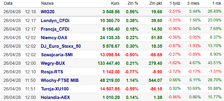 Rynki w Europie pozostają w fazie marazmu i wyczekiwania, czego dowodem jest niemrawa postawa indeksu DAX oscylującego wokół 24 135 pkt (+0,22%) oraz Stoxx 50 (+0,30%), w cieniu nierozwiązanych napięć geopolitycznych na Bliskim Wschodzie i blokady strategicznej Cieśniny Ormuz. Inwestorzy przyjmują postawę „wait and see” przed kluczowymi decyzjami Fed, EBC oraz Banku Anglii, obawiając się, że lepka inflacja napędzana cenami energii zmusi decydentów do utrzymania restrykcyjnej polityki pieniężnej kosztem i tak już słabnącego wzrostu gospodarczego. Podczas gdy Bank Japonii utrzymał stopy bez zmian, dając jednak jastrzębi sygnał na przyszłość, Euroland zmaga się z brakiem jasnych impulsów, szukając kierunku w nadchodzących raportach gigantów technologicznych z USA. Względna siła WIG20 (+0,56%) na tle kontynentu wyróżnia Warszawę, jednak niska zmienność na głównych parkietach, takich jak Londyn czy Paryż, potwierdza powszechny dystans do ryzyka przed publikacją bilansów amerykańskich spółek. W efekcie handel po południu przypomina „ciszę przed burzą”, gdzie każde zaostrzenie retoryki na linii Waszyngton–Teheran lub jastrzębia niespodzianka ze strony banków centralnych może przerwać obecną, kruchą stabilizację.