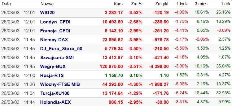 Euroland tonie dziś w czerwieni – WIG20 spada o ok. 3,5%, a DAX traci blisko 4%, kontynuując wczorajszą przecenę mimo wcześniejszych nadziei na spokojniejszą reakcję inwestorów. Widać, że kapitał w pośpiechu ucieka z akcji, bo wojna w Zatoce Perskiej i zamknięcie Cieśniny Ormuz podnoszą ryzyko realnego szoku podażowego na rynku ropy. Można częściowo mówić nawet o typowym schemacie kryzysu geopolitycznego, spadkach indeksów akcji, umocnieniu dolara, rajdzie złota oraz dynamicznym wzroście cen ropy i gazu, które już dziś zaczynają przepisywać w górę ścieżki inflacji. W efekcie na mapie Europy praktycznie wszystkie główne parkiety świecą na czerwono, a dzisiejsza sesja wygląda jak pierwszy pełnoskalowy test odporności giełd na scenariusz dłuższego konfliktu na Bliskim Wschodzie.